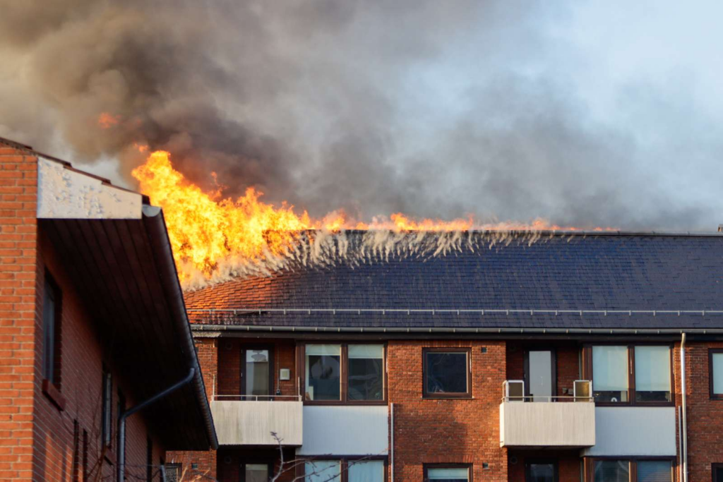 Tårnhøje flammer hejser sig op fra etageejendommens tag, mens flere lejligheder er fuldstændig raseret nedenunder.
