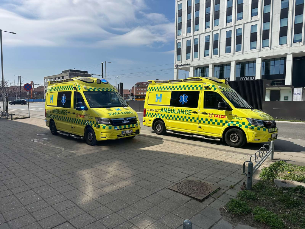 Der er øjensynligt tale om to ambulancer og en enkelt lægebil. Andre politikøretøjer ses ligeledes til stede i området.