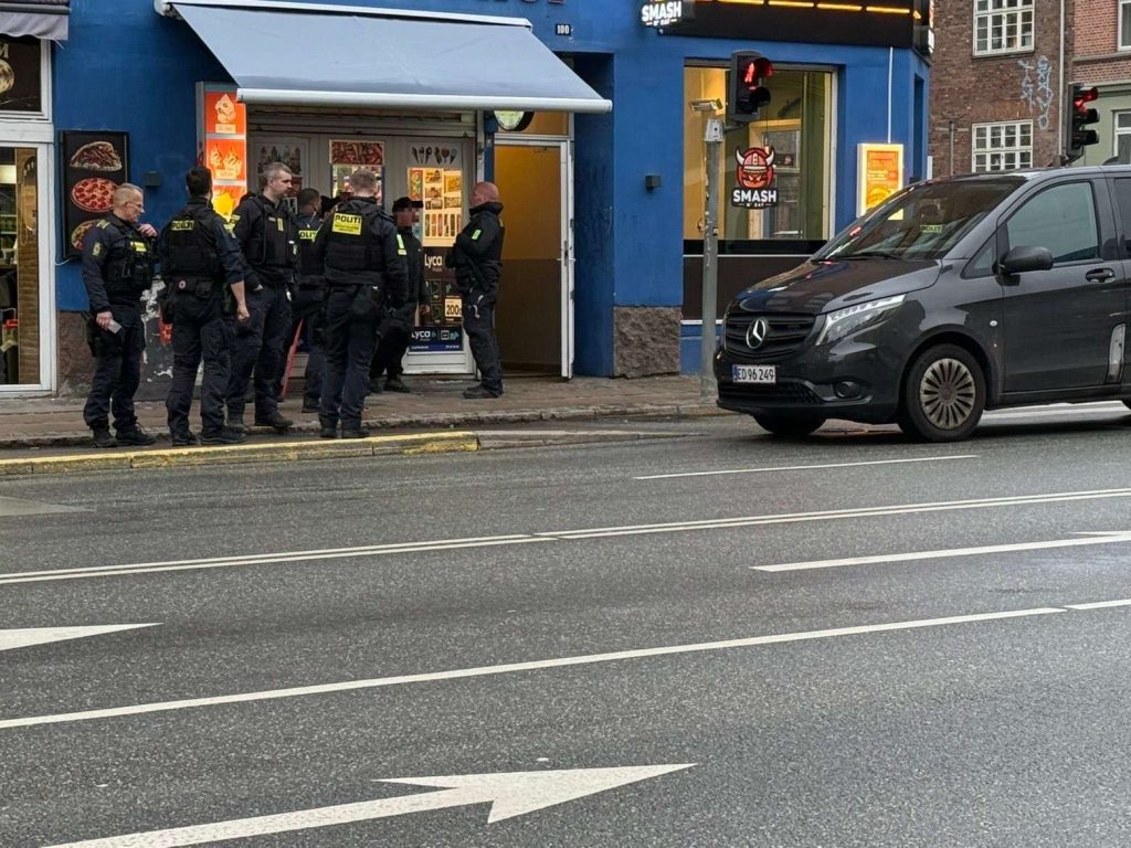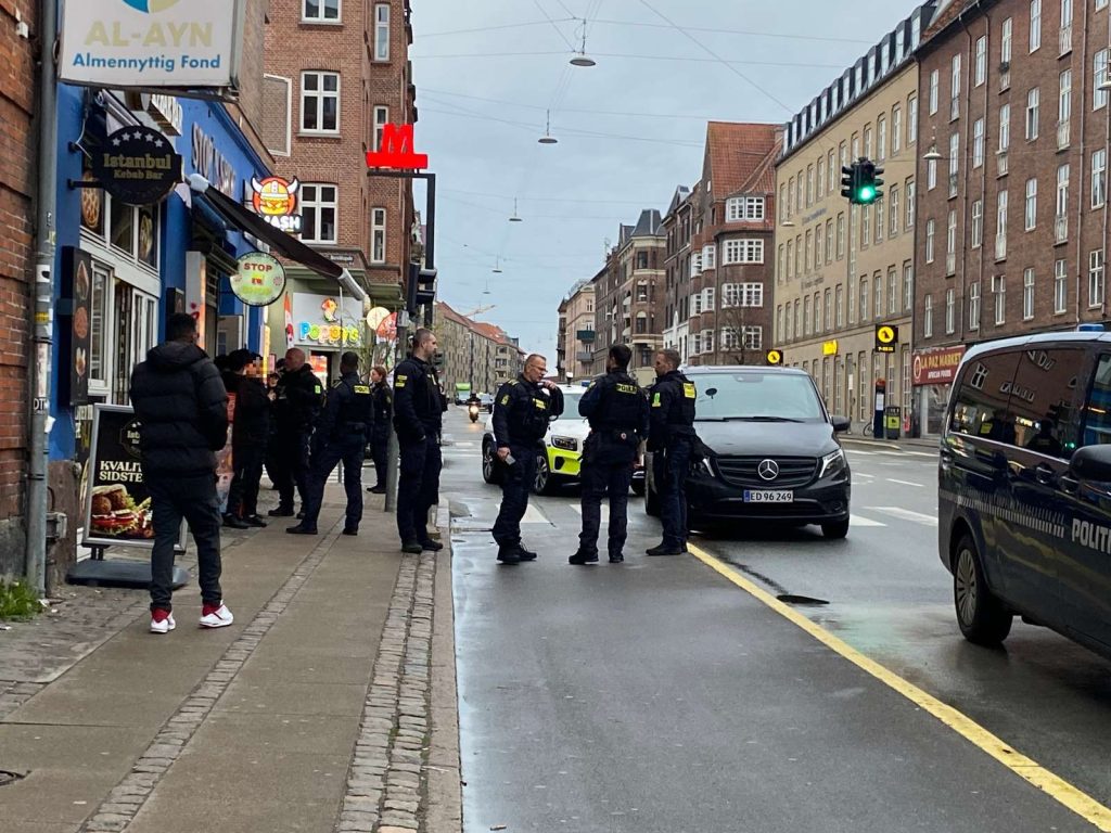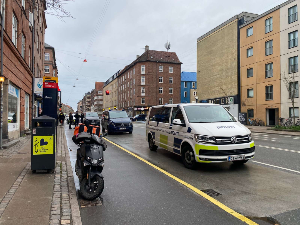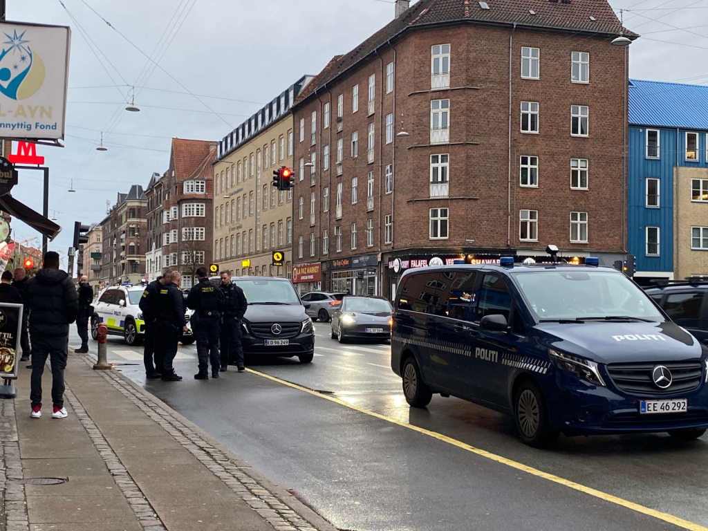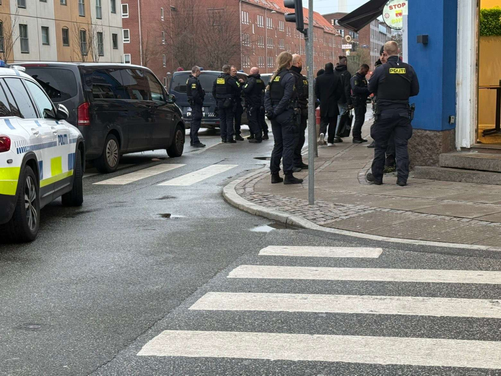 Billeder fra stedet viser søndag aften, at politiet er talstærkt til stede omkring et gadehjørne i København.