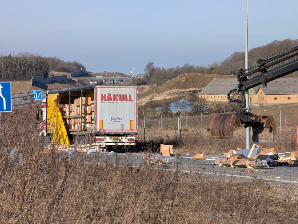 En stor lastvogn fyldt til randen, har på dramatisk vis smidt sit gods midt på en meget traffikeret motorvejstilkørsel.