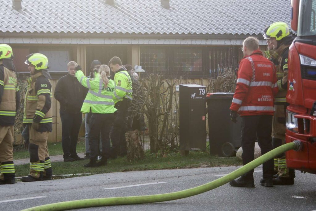 Samtidig er flere brandslanger trukket fra brandbilerne, langs vejen og hen til adressen.