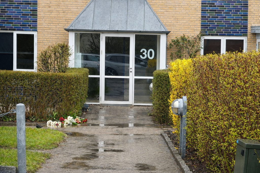 Her ses blomster tirsdag ligge foran gerningsstedet – se billeder nederst fra politiets tilstedeværelse kort efter drabet