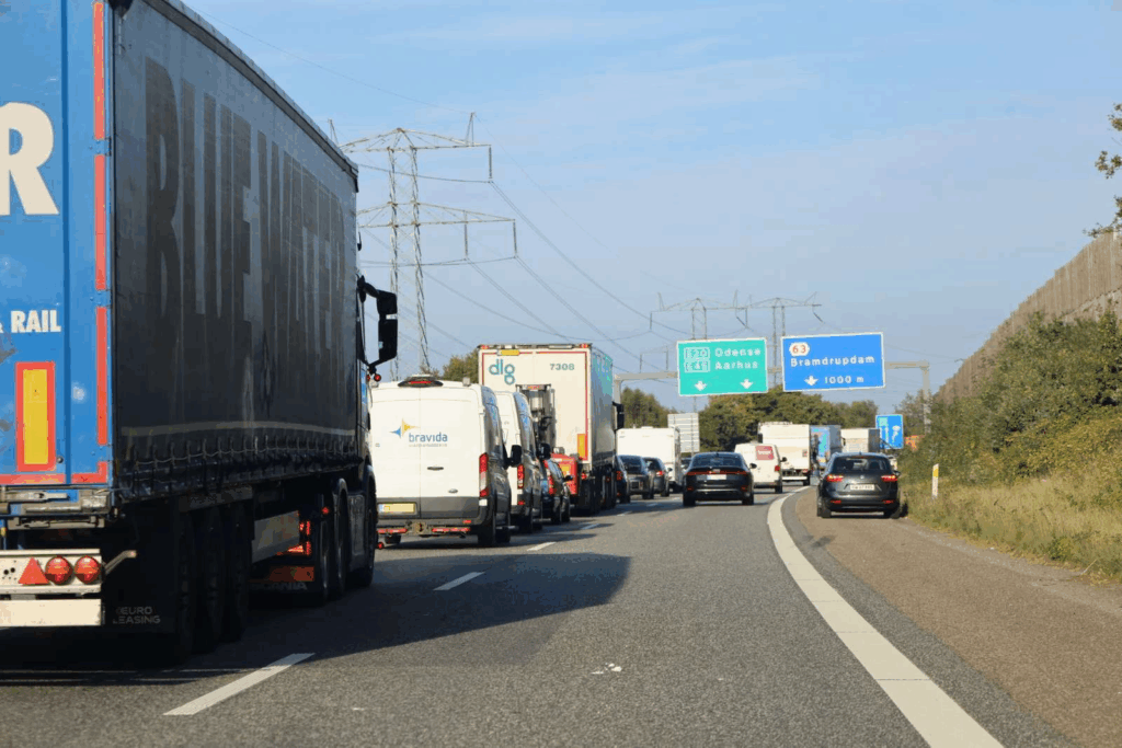 Indtil videre er der ikke meldt om personskade, men uheldet har skabt kø og betydelig trængsel på strækningen.