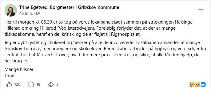 "Jeg er blevet kontaktet af nyheden om en togulykke uden for København. Jeg har kontaktet den danske statsminister Mette Frederiksen i morges og tilbudt svensk hjælp til håndteringen af den tragiske togulykke, skriver statsminister Ulf Kristersson i en kommentar til SVT News.