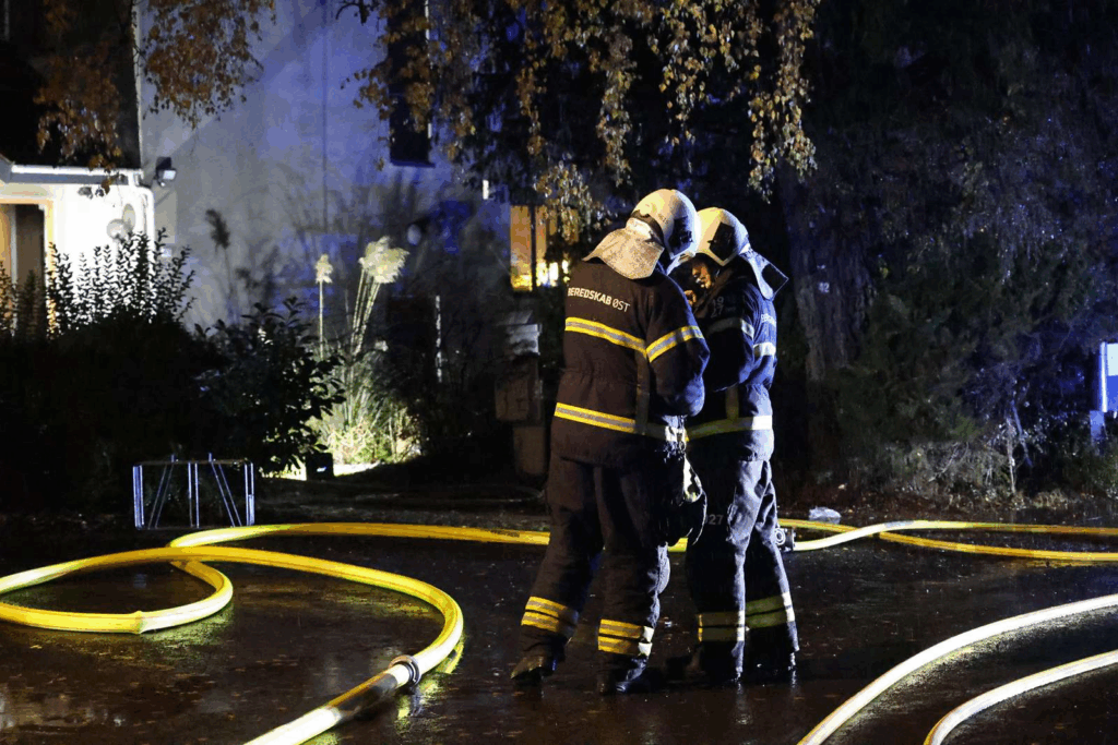 Billeder fra stedet viser, at flere brandslanger er trukket ind i huset.
