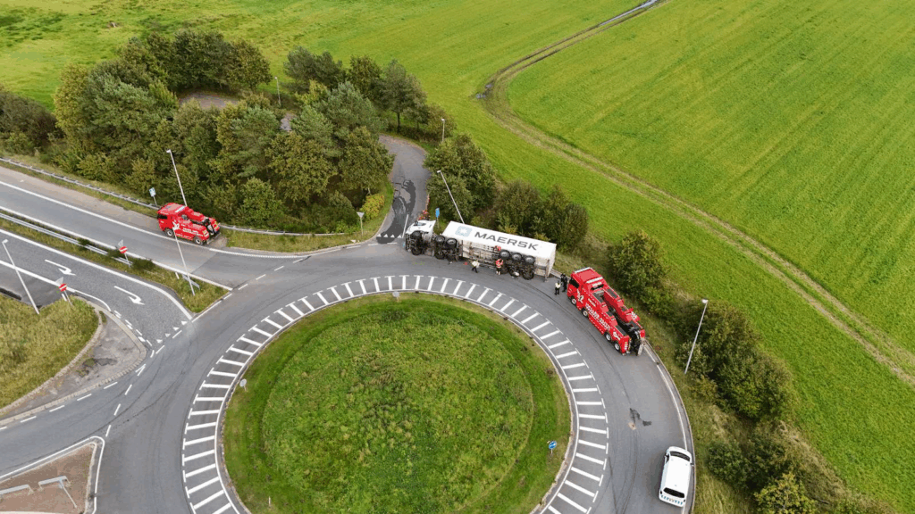 Hændelsen er et solouheld, der involverer en Mærsk-lastbil med anhænger.