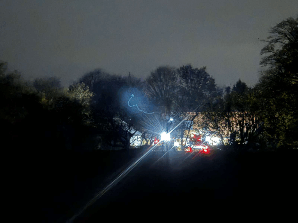 “Ved ankomst til stedet lufter der brand – og man kan se, at brandfolk har kørt en stige op til skorstenen. Der er dog ikke tydelige flammer,” siger vores udsendte.