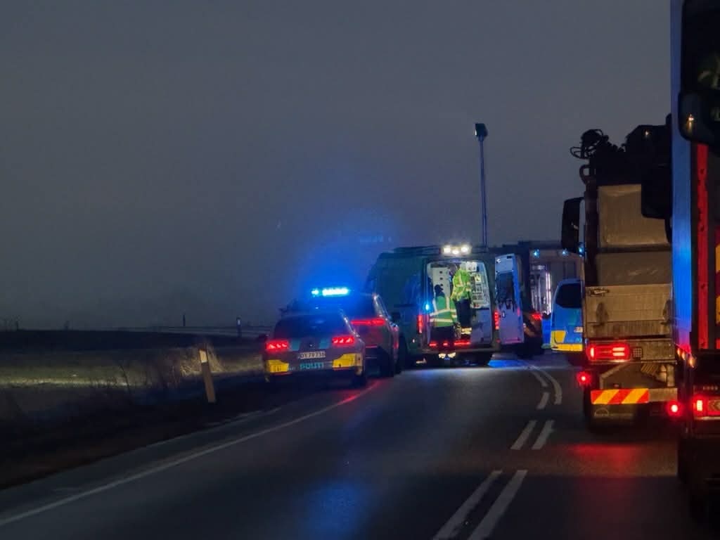 ‘Vi fik anmeldelsen ind klokken 06.47. Det var et færdselsuheld med to biler, og vejen har været helt spærret helt af til morgen.’