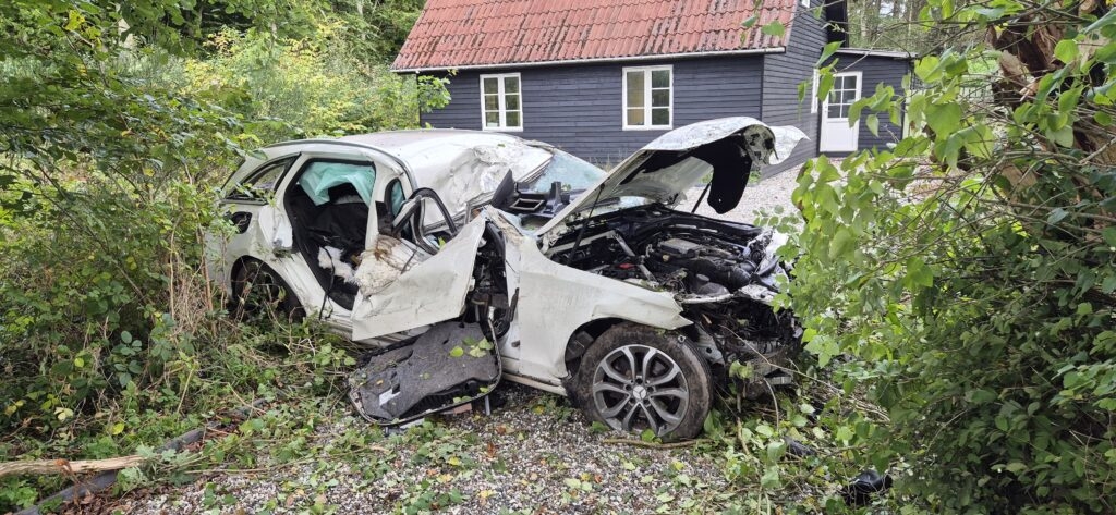 Ulykken skete den 29. september, hvorefter en grå personbil lå helt krøllet sammen i et buskads ved en ejendom.