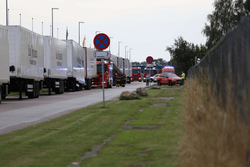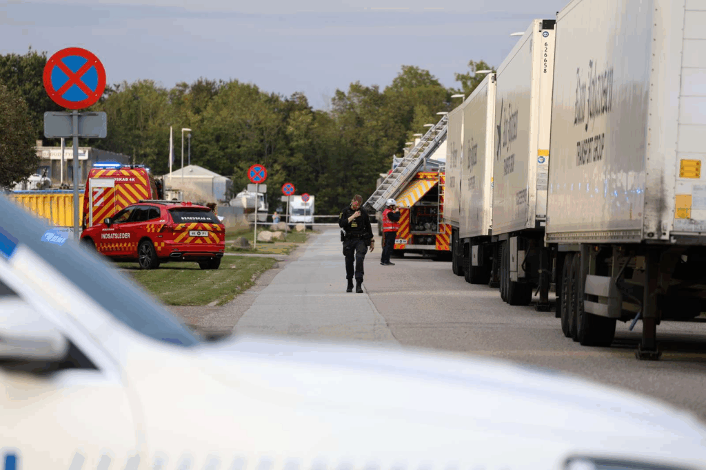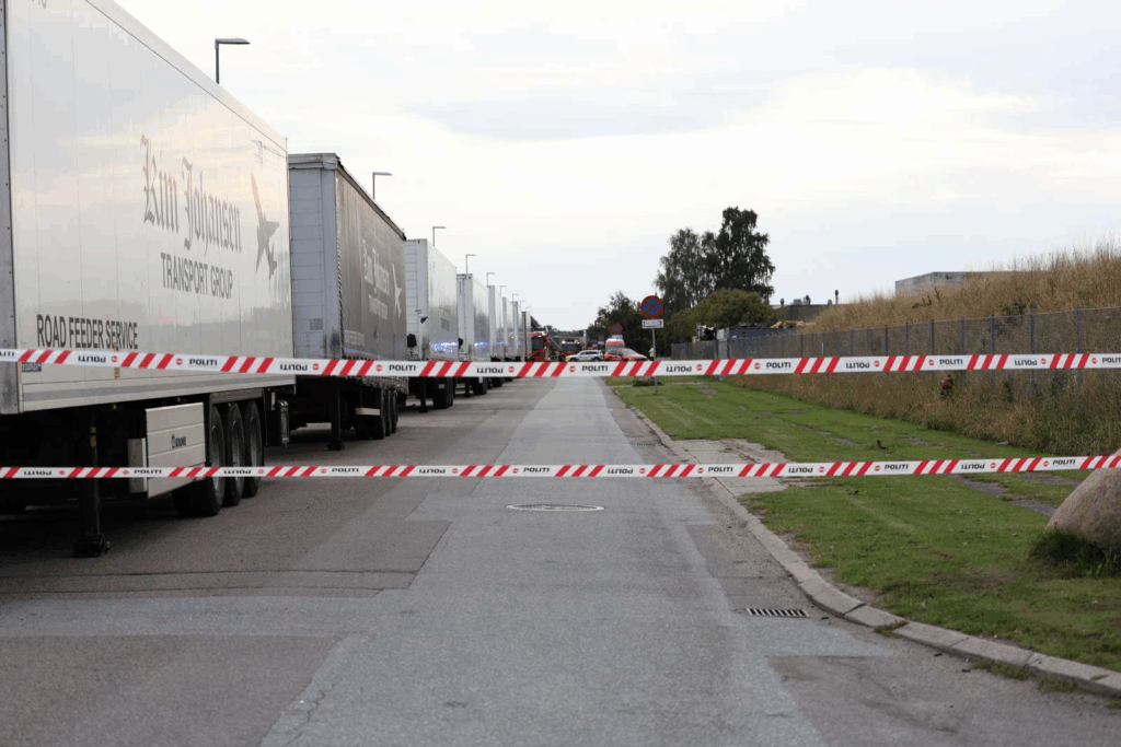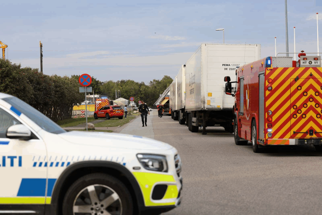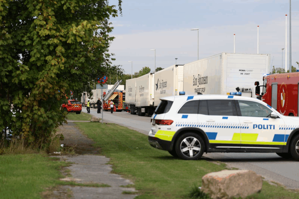 Lørdag aften er politiet og beredskabet til stede i et afspærret område ved en række lastbiler.