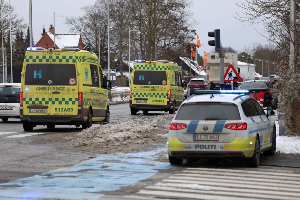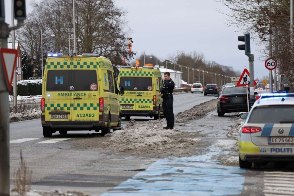 Billeder fra uheldsstedet viser to ambulancer, der er holdt ind til siden på en vej. I nærheden, halvt på cykelstien og halvt på fortorvet, holder en mørk personbil havareret.