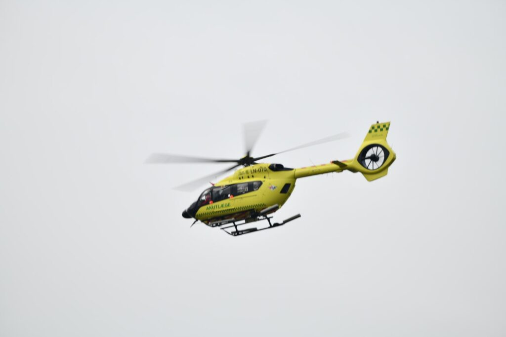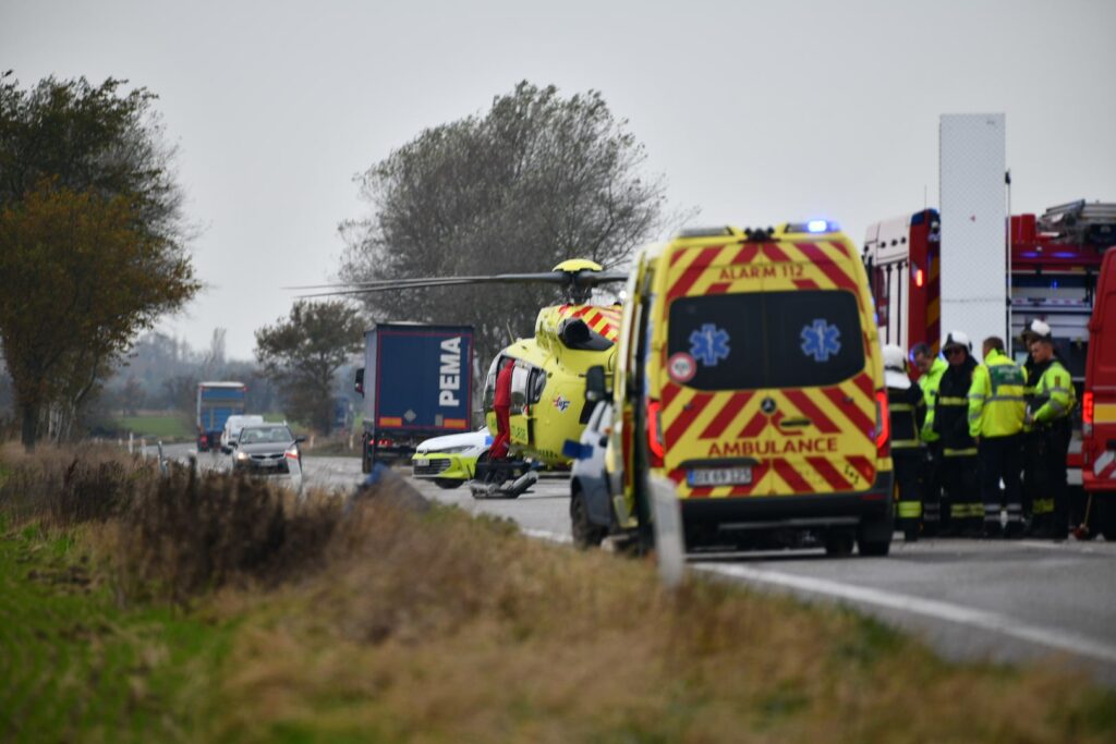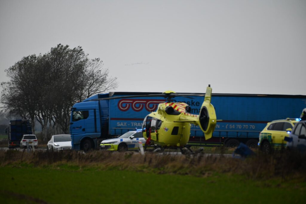 En redningshelikopter er også tilkaldt, og den er nu landet midt på vejen ved ulykken.