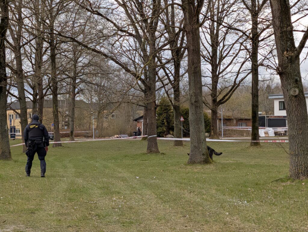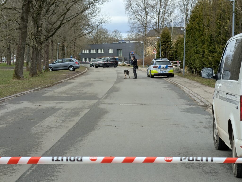 Flere politipatruljer ses på stedet, hvor der bliver brugt hunde til efterforskningen.