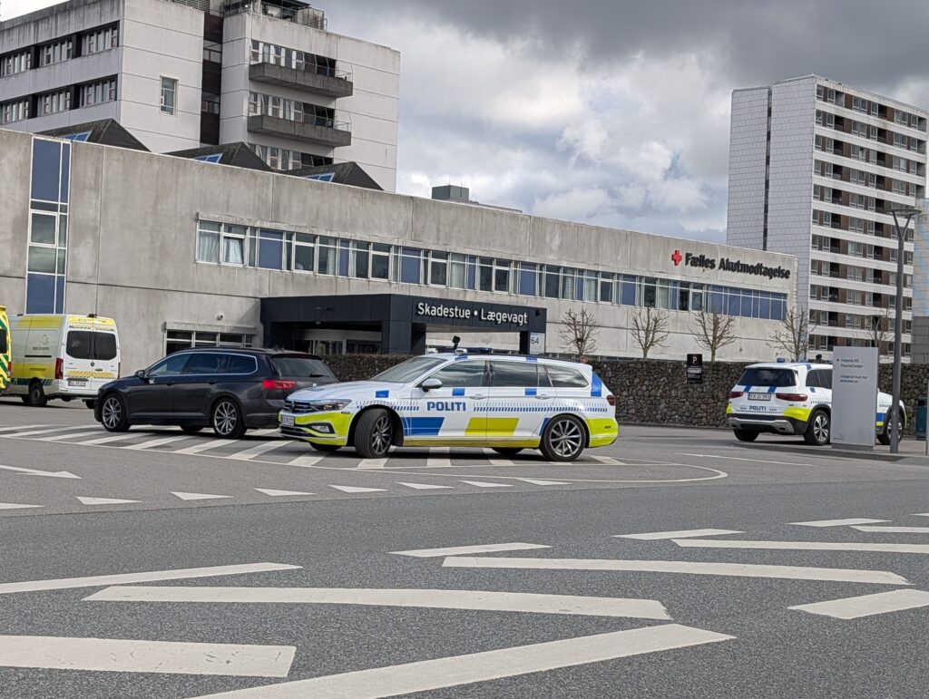 Presse-fotos.dks udsendte oplyser desuden, at der ved Odense Universitetshospital også er meget politi, efter at manden blev kørt ind til behandling.