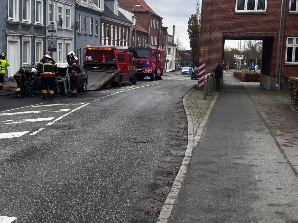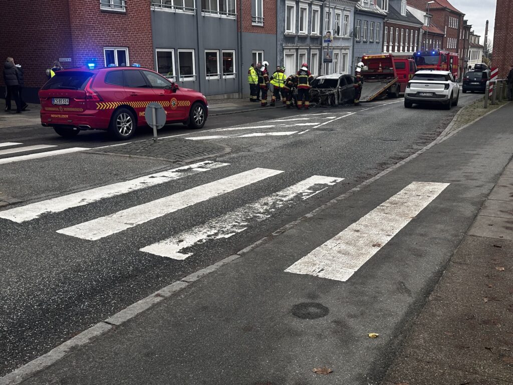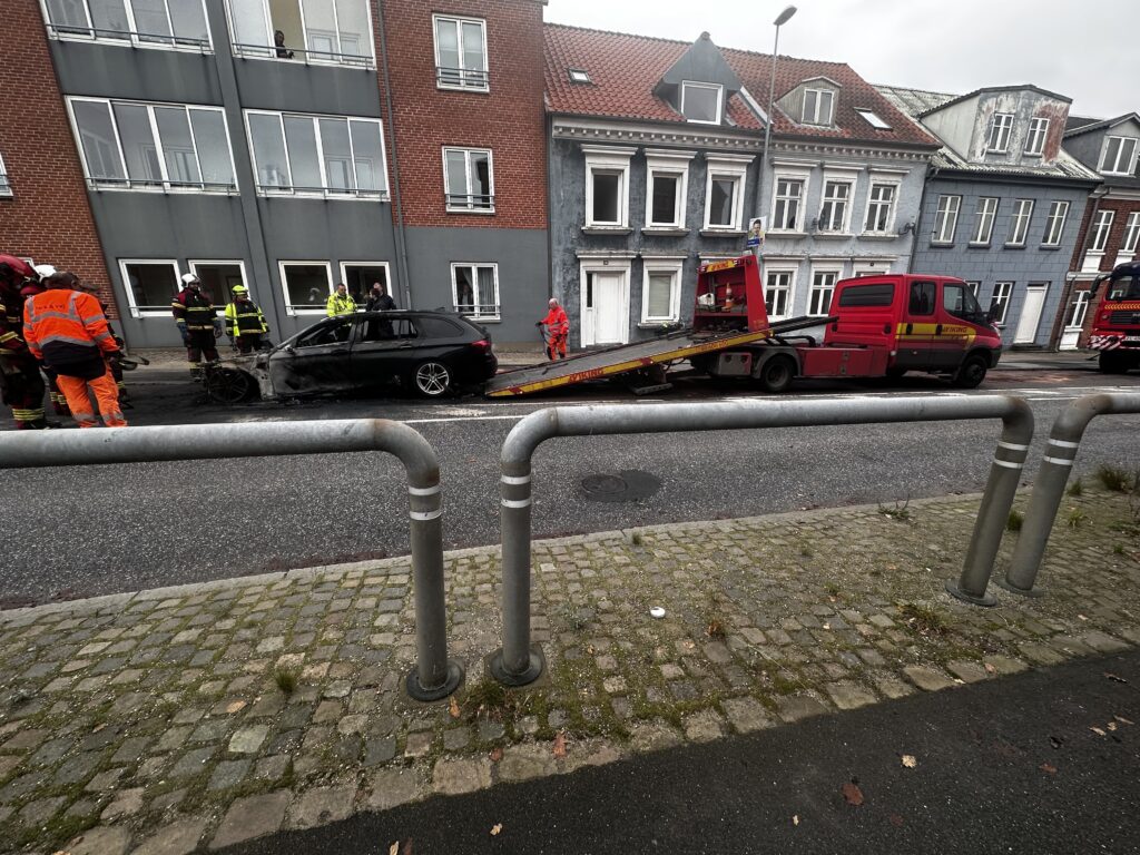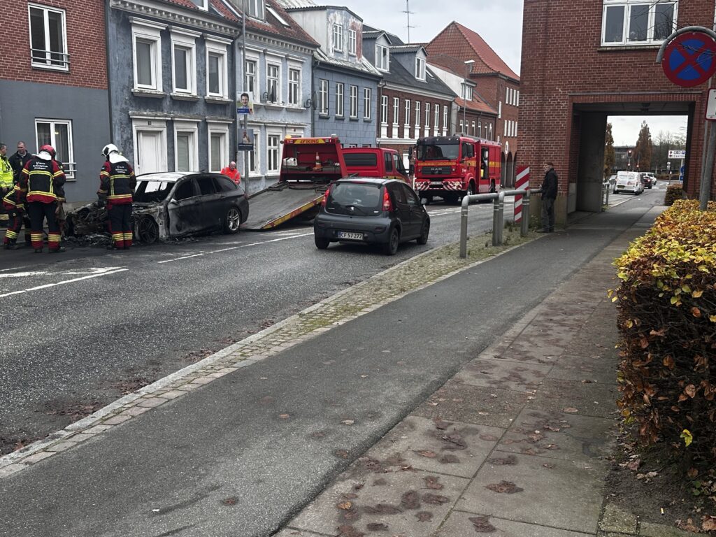 Bilen kørte på Møllegade i Skive, da flammerne fik fat. Gaden var spærret i en times tid, mens slukningsarbejdet var i gang.