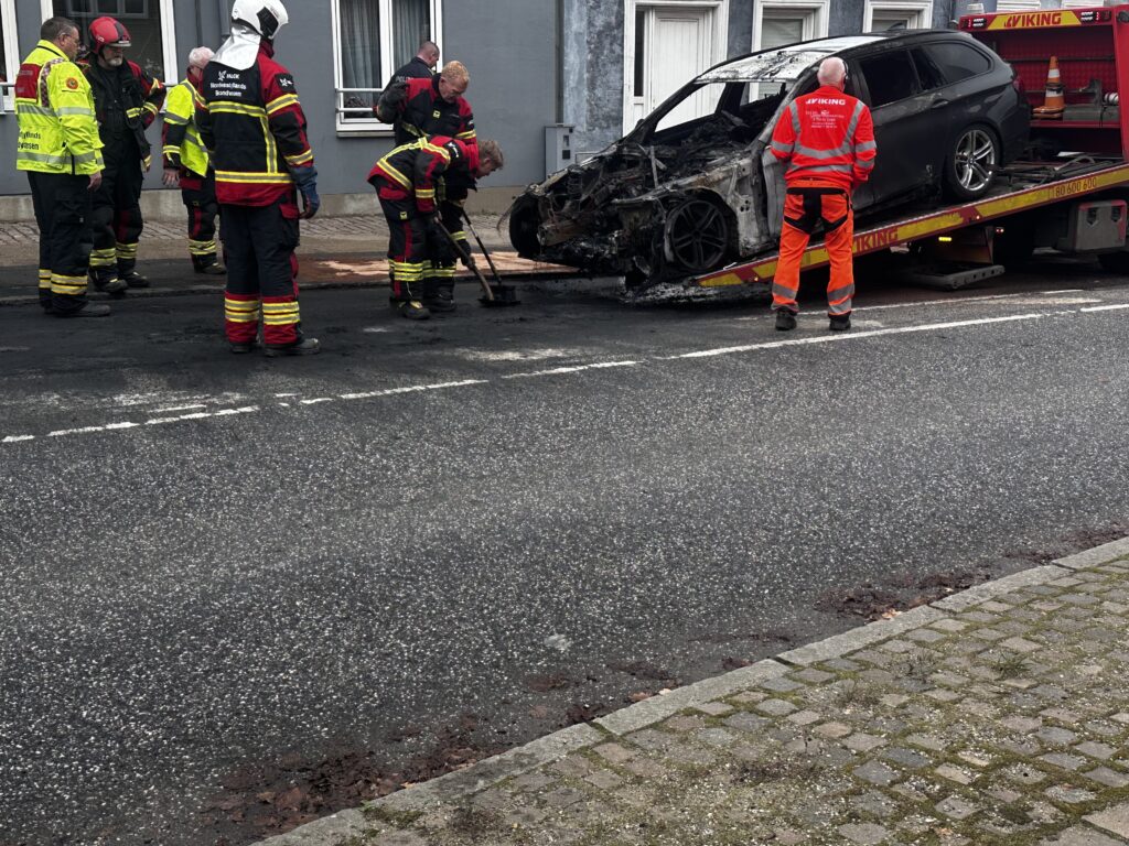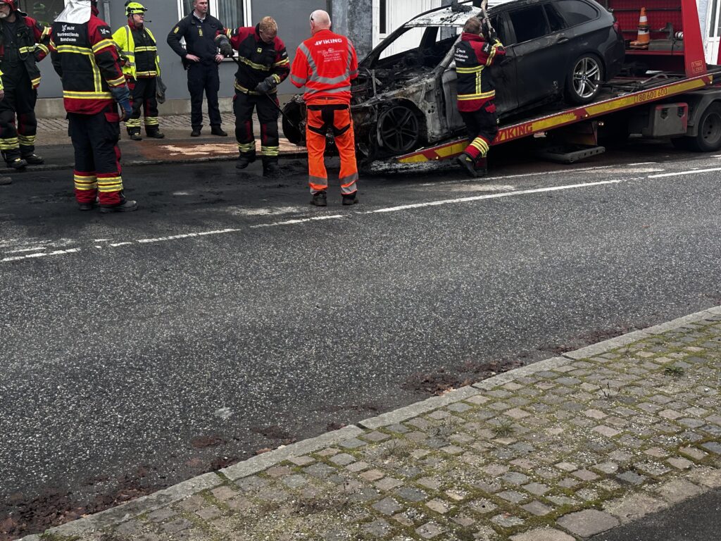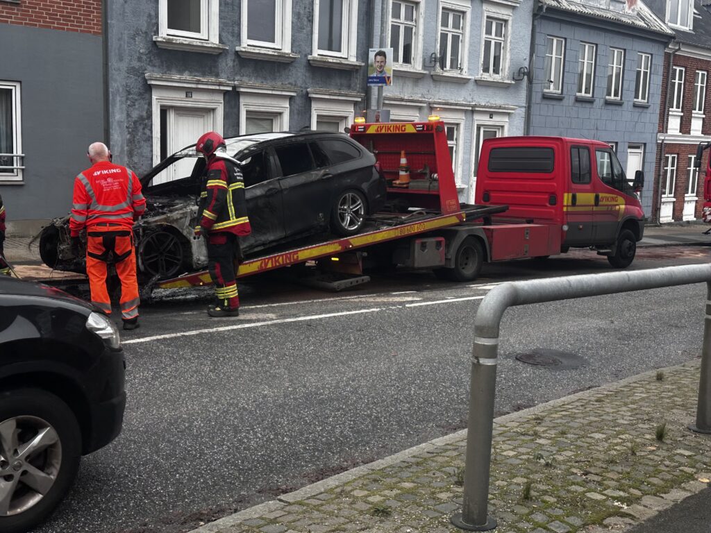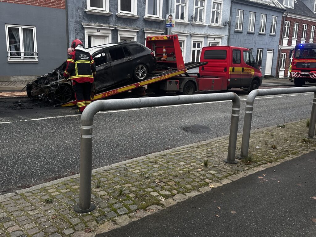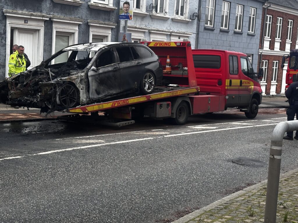 Bilen kørte på Møllegade i Skive, da flammerne fik fat. Gaden var spærret i en times tid, mens slukningsarbejdet var i gang.