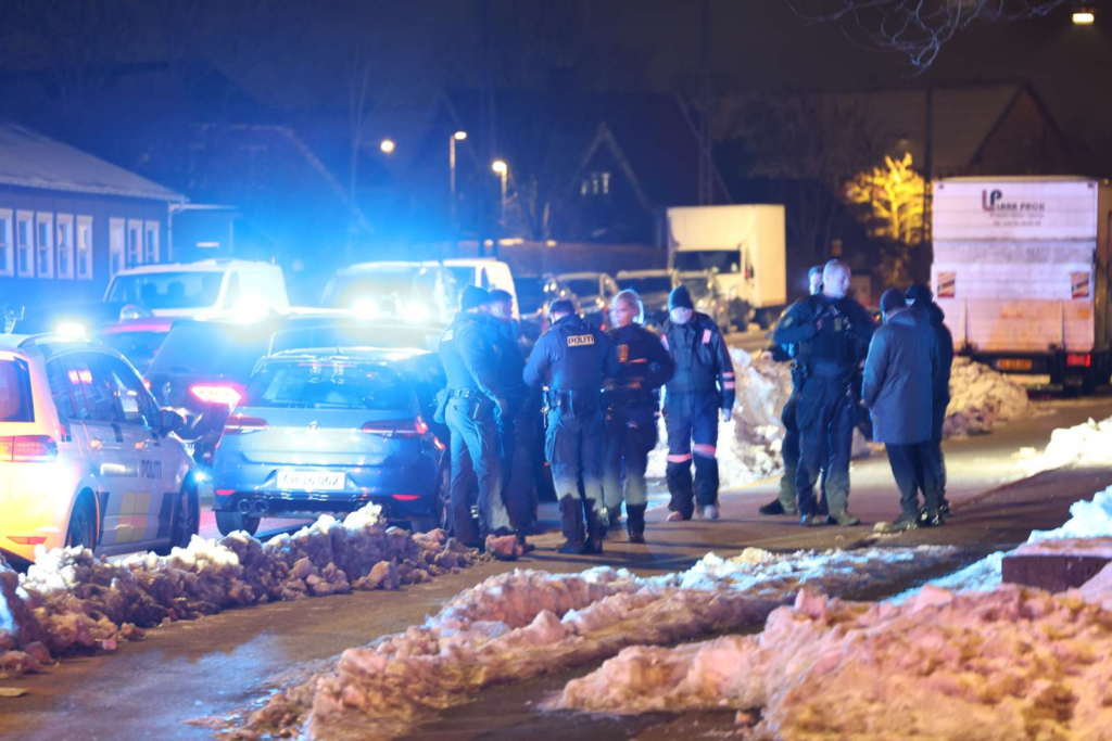 Flere politifolk befinder sig på gaden, som oplyses af blinkende blå lys.
