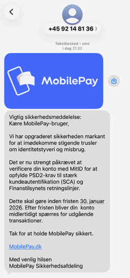 Videre i beskeden opfordres brugeren til at verificere sin MobilePay-konto med MitID inden den 30. januar. Hvis det ikke sker vil kontoen blive spærret, lyder det.