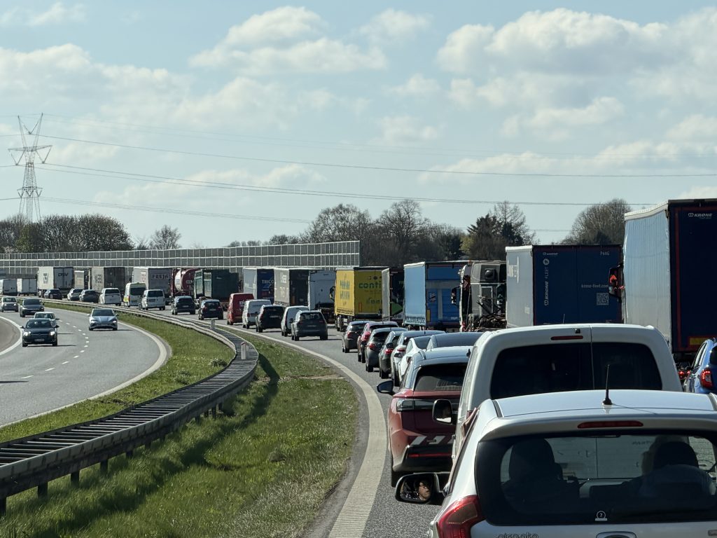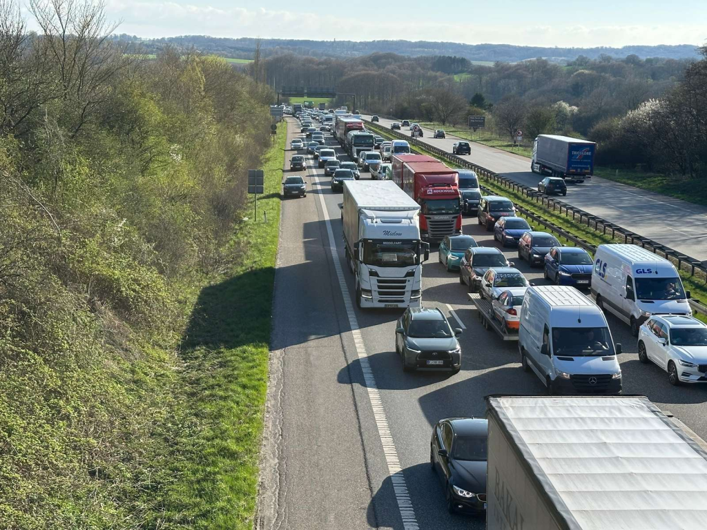 Et hav af bilister må derfor vente med tålmodighed og slå koldt vand i blodet på grund af det færdselsuheld, der har skabt de kaotiske scener og kilometerlange køer.