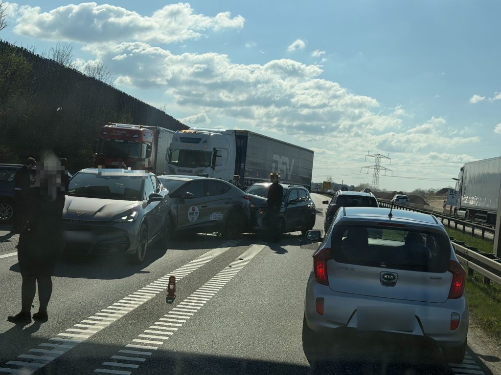 En motorvej er i forbindelse med et færdselsuheld mellem flere personbiler blevet fuldstændig afspærret. Færdselsuheldet er sket ved et trafikknudepunkt, og derfor er der nu forlænget rejsetid på mere end en time langs flere motorvejsstrækninger