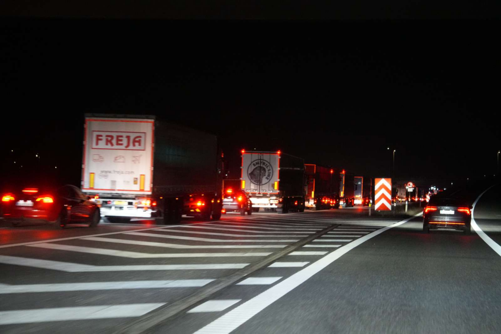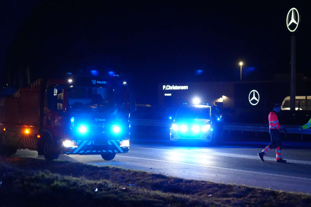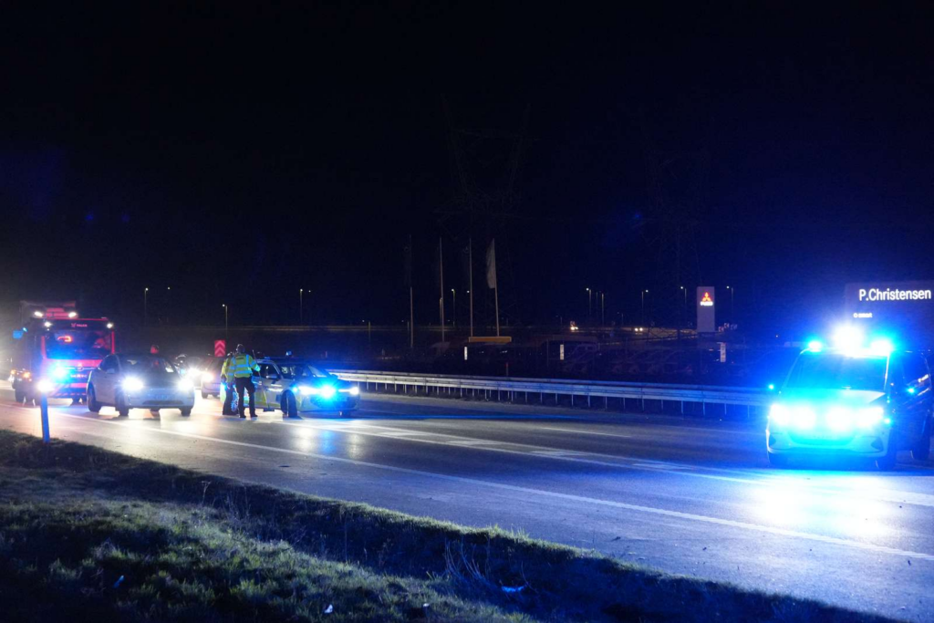 Sammenstødet har medført store materielle skader, og situationen har fået politiet til at spærre hele motorvejen i én retning.