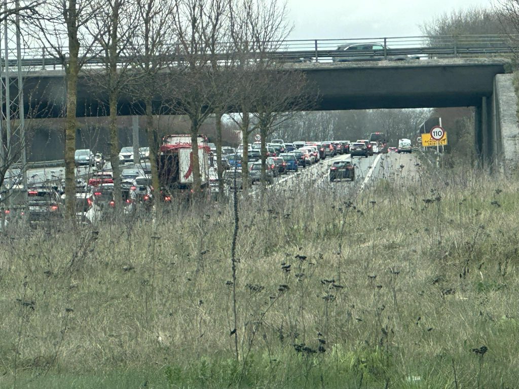 Trafikken bliver derfor ledt væk fra motorvejen.