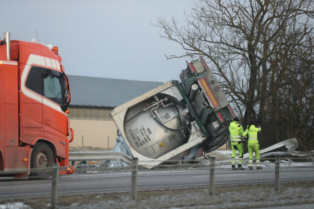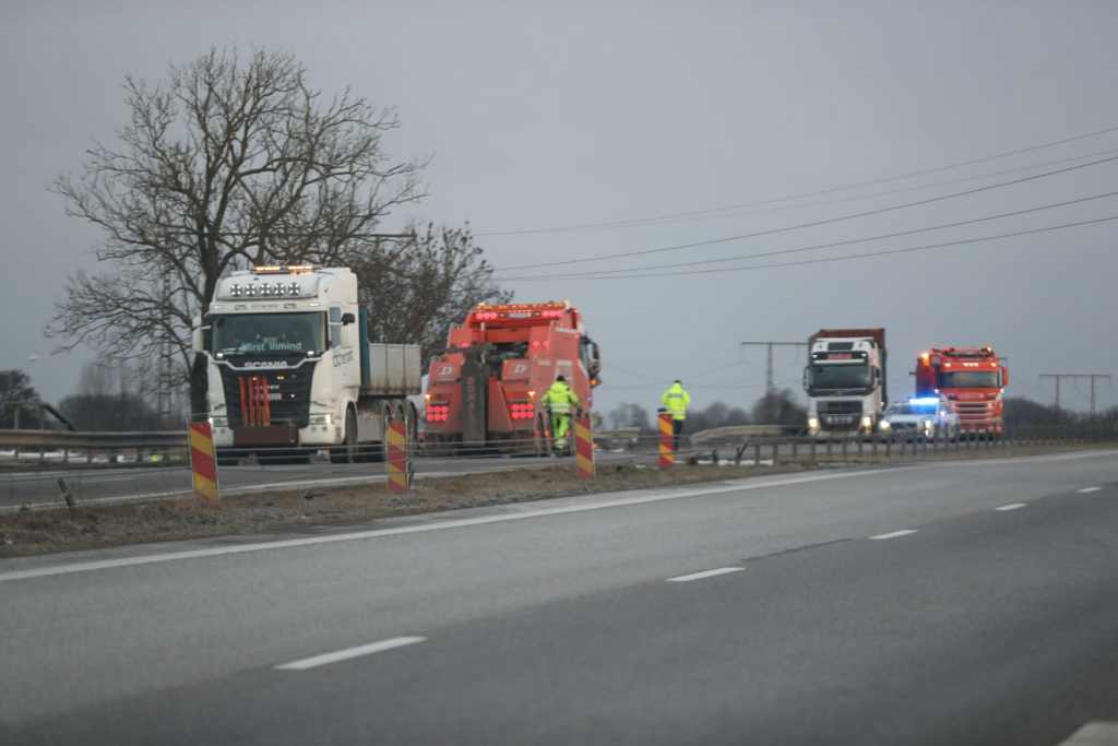 Motorvej mod Danmark helt spærret: Lastbil ligger på hovedet