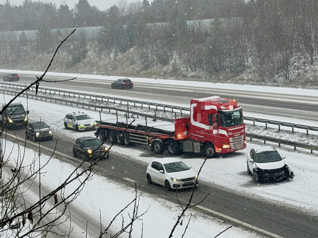 Flere ulykker finder mandag morgen og formiddag sted, mens sneen daler. På en motorvejsstrækning er der derfor blot et farbart spor, mens oprydningsarbejdet står på ved et ulykkessted.