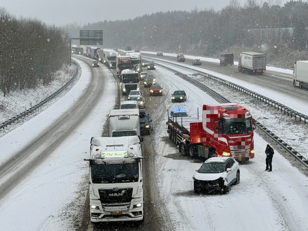 Her er oprydningsarbejdet i gang, hvorfor motorvejen er blevet delvist spærret. Derfor er der kun et spor, som er farbart.