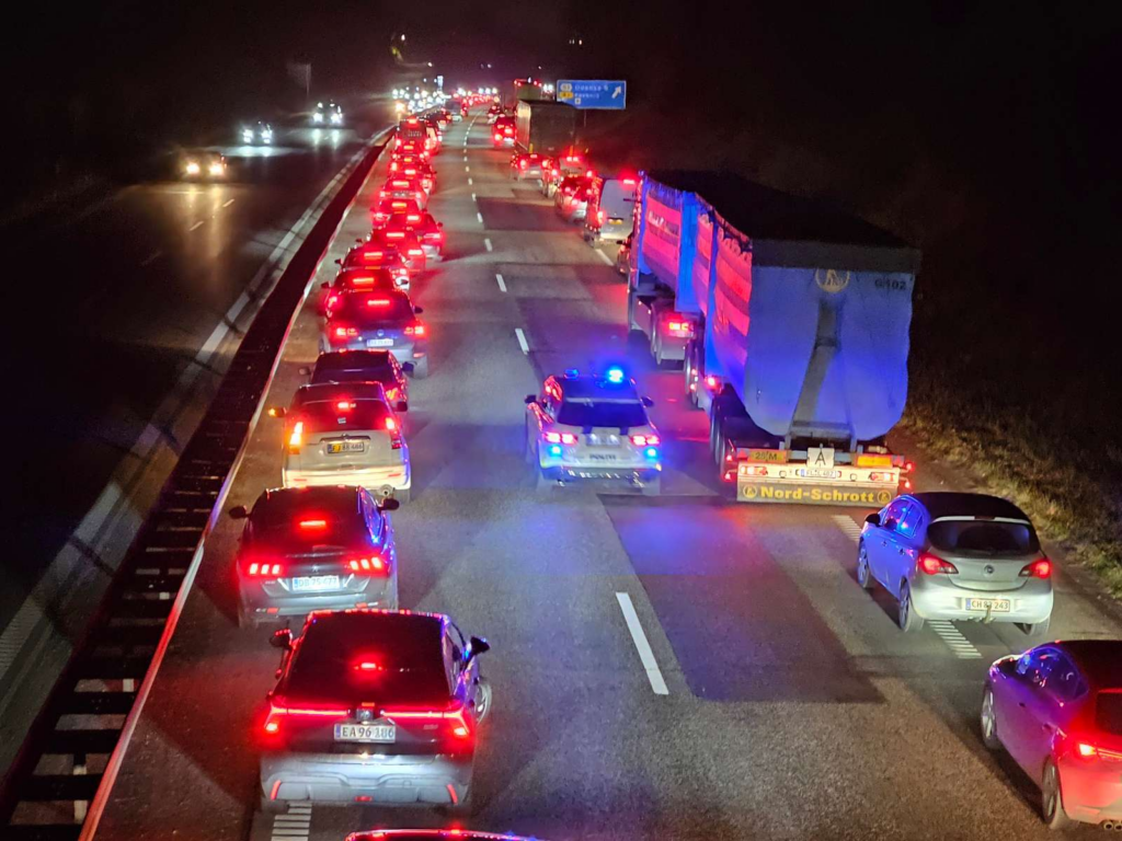 ‘Uheld, Spor spærret. Venstre spor spærret. Politi og redning er på stedet. Forventet rejsetid op til 30 minutter’ lyder det på Vejdirektoratets trafikkort.
