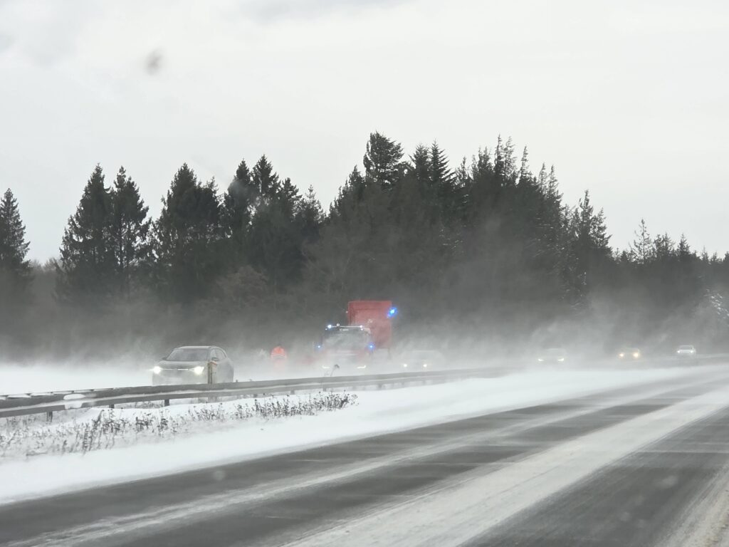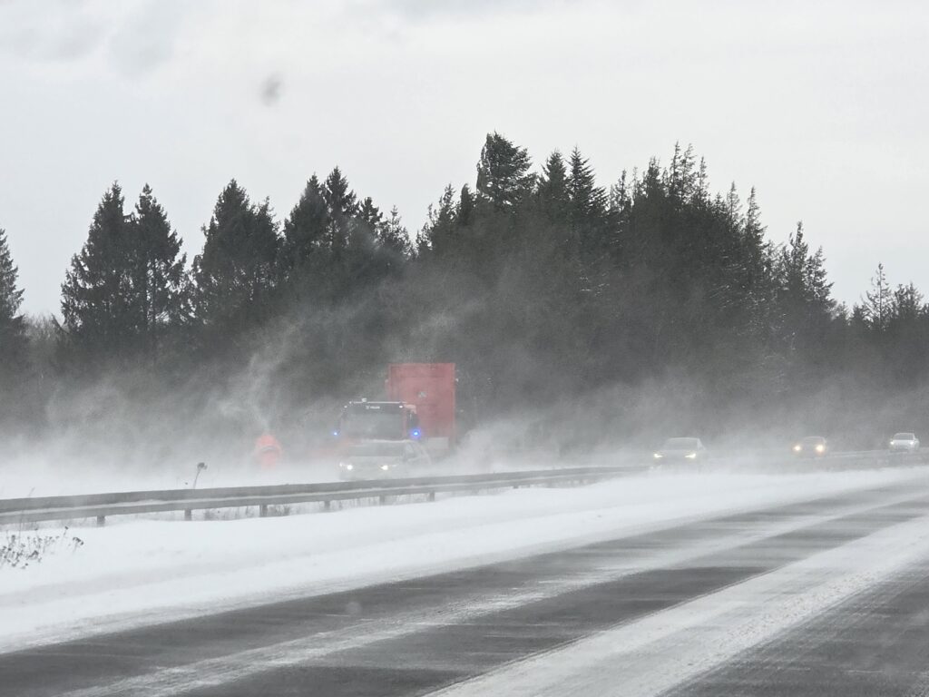 Flere steder i landet fyger sneen hårdt og det går udover vejene.