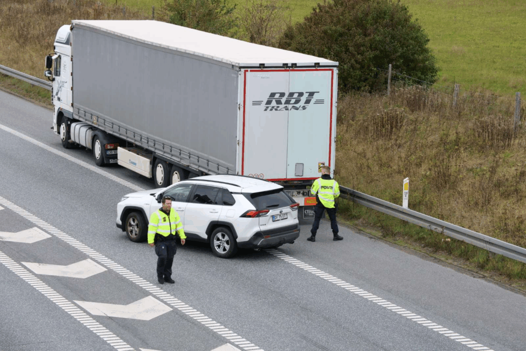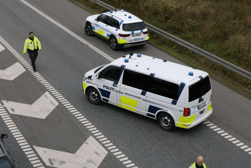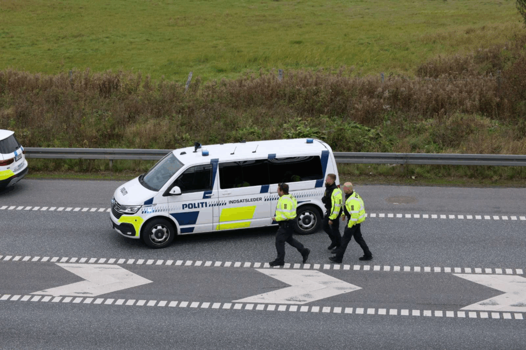 Flere patruljer og indsatsleder er til stede, mens bilister bliver ledt forbi stedet med forsigtighed.