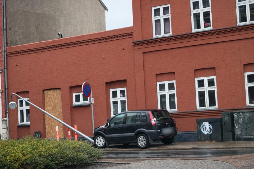 Presse-fotos.dk har været på stedet på hjørnet af Sjællandsgade og Dalegade, hvor en lygtepæl lå væltet efter at være blevet ramt af en bil i løbet af natten.