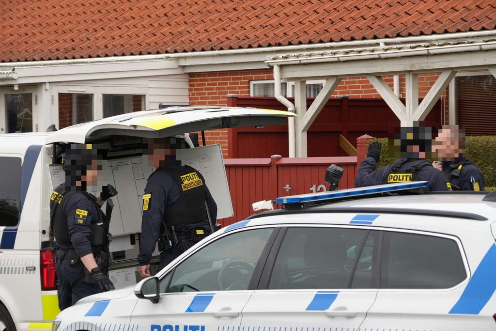 Flere politibetjente går rundt med automatvåben, mens ambulance og sundhedspersonale står tæt på huset.