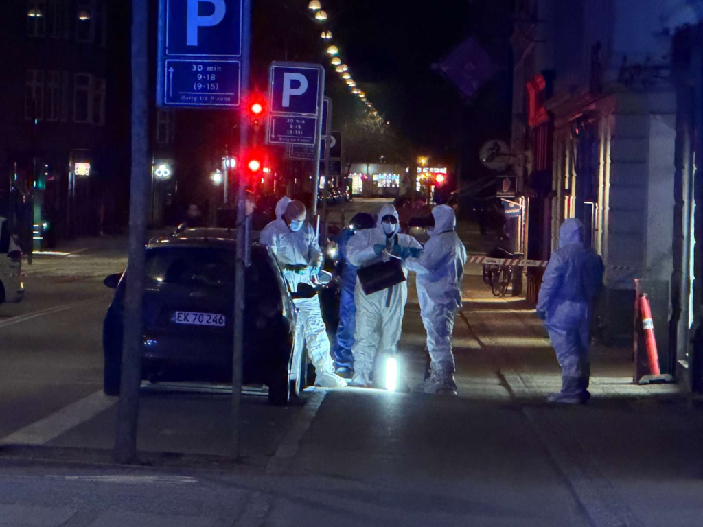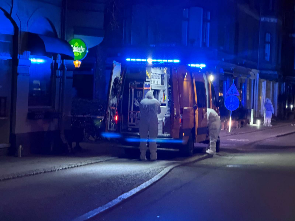 Politiet holder kortene tæt til kroppen, når det kommer til hvorfor de var midt i byen natten til mandag. Billeder fra stedet viser, at der blev samlet en del bevismateriale.