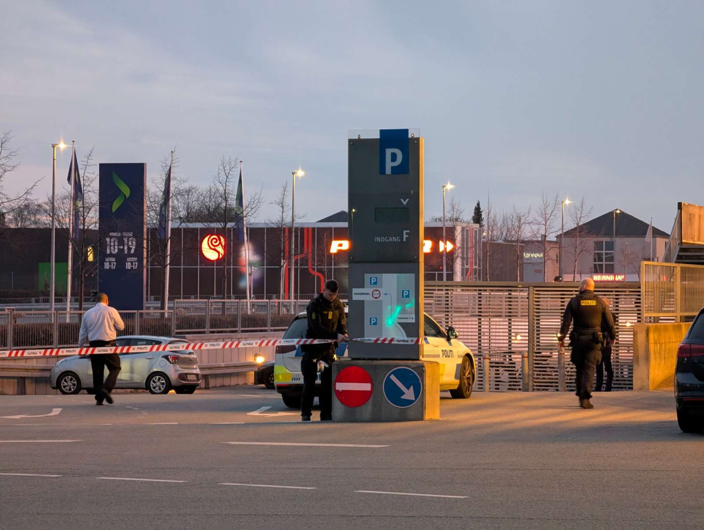 Foran centret er politiet i gang med at afspærre et område på en parkeringsplads.