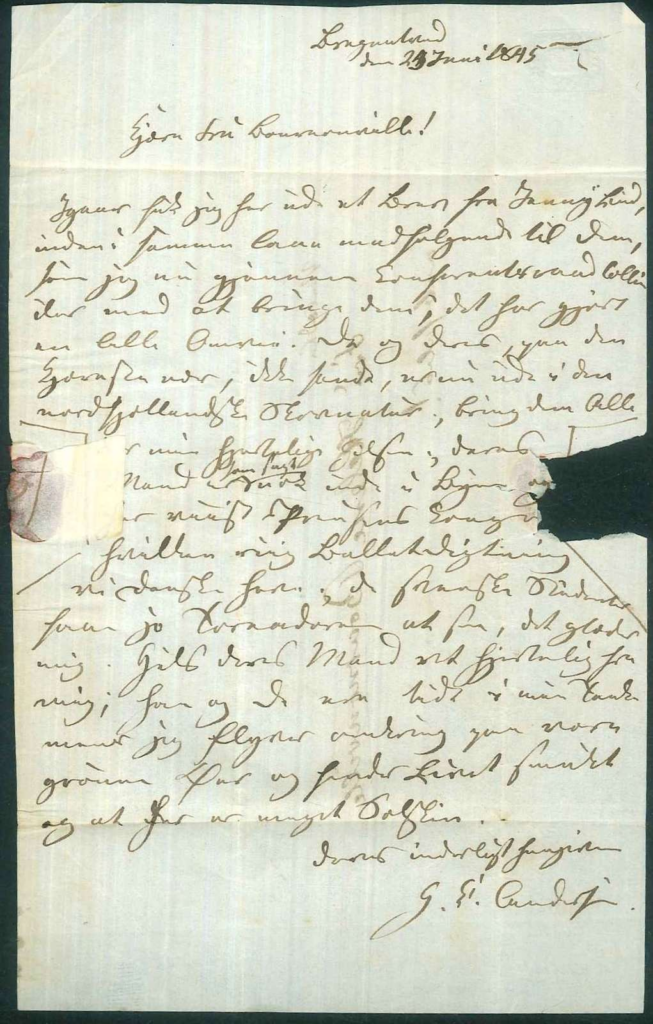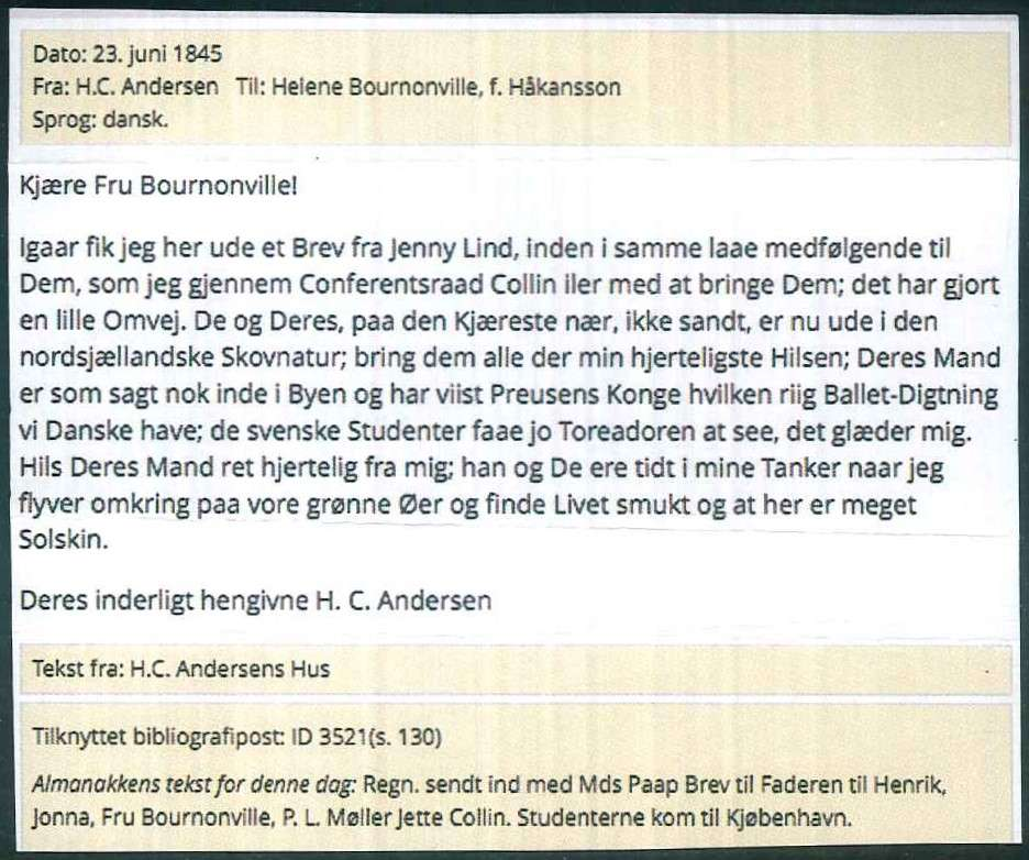 I brevet til ‘Fru Bournonville’ sender den store forfatter sine varmeste tanker til familien og glæder sig over, at August Bournonville har fået muligheden for at fremvise den danske balletkunst for den preussiske konge – på det tidspunkt Frederik Wilhelm 4.