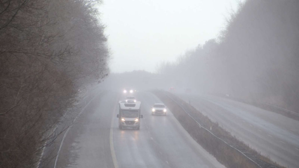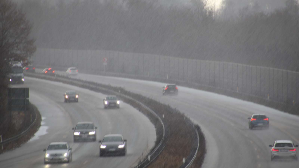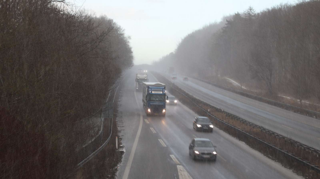 På ingen af motorvejens to spor ses noget hvidt snedække, men i nødsporet og på selve rastepladsen er der ingen tvivl – nu sner det i Danmark.