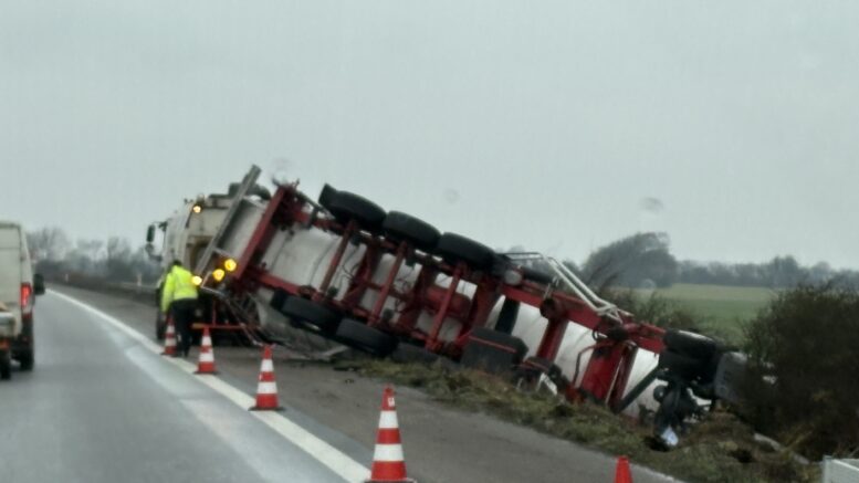 Lastbil i grim ulykke: Ligger på siden i grøft