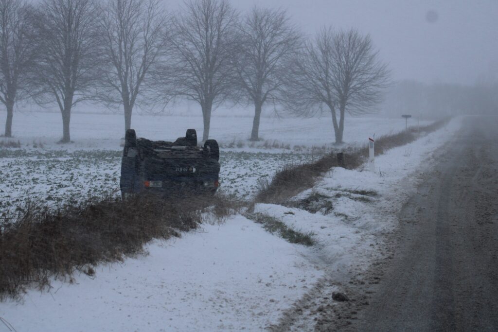 Billeder fra stedet viser i den forbindelse, at køretøjet er kørt galt på en snebeklædt landevej, hvor den er endt på en nærliggende mark og nu ligger på taget.