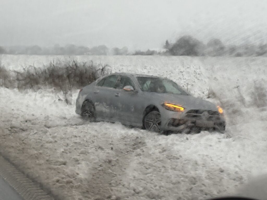 Dog skaber det også store problemer i trafikken, hvor bilerne på motorvejen skøjter rundt på de sne- og isglatte veje.