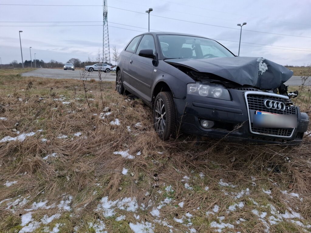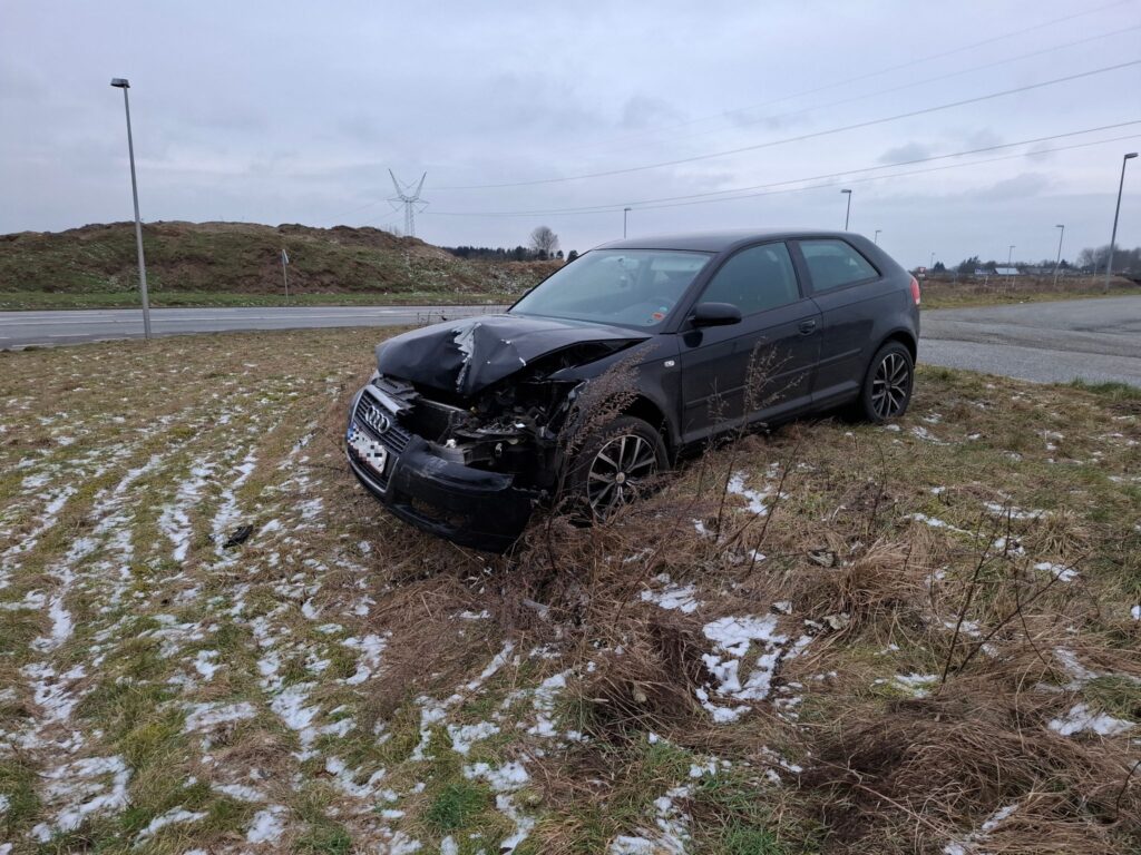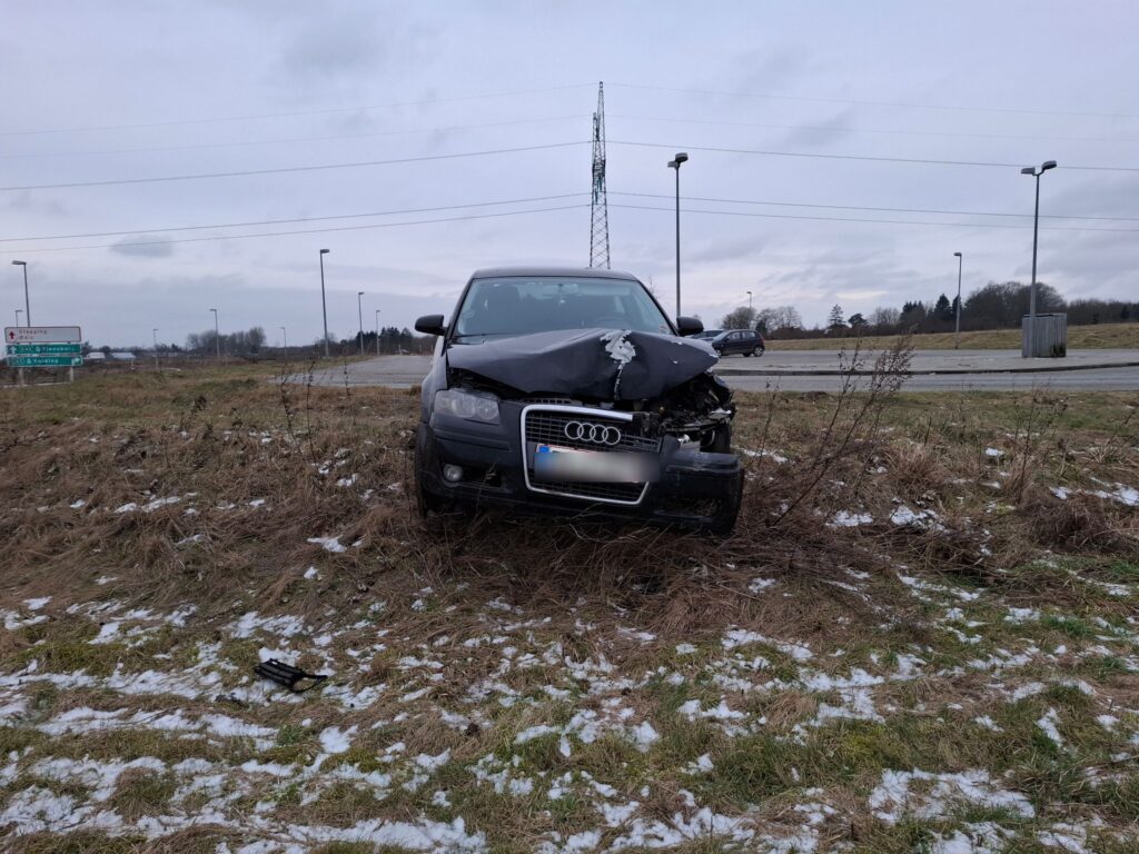 En sort Audi er kørt galt på en p-plads tæt ved motorvejen.