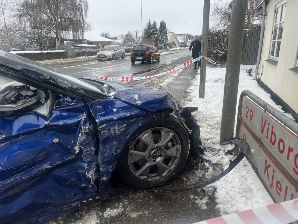På billederne fra Presse-fotos.dks udsendte kan man se, at passagersiden på bilen er fuldstændig smadret.