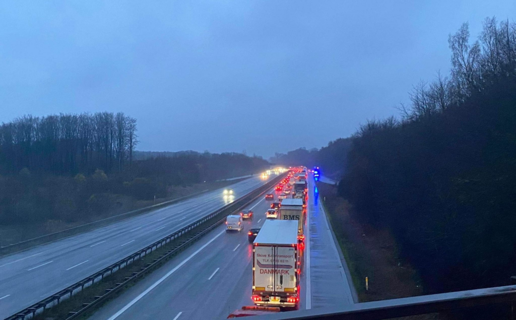 Sådan fremgår det af P4’s Trafikmeldinger kort før klokken 07.30 onsdag morgen, efter et motorvejsuheld.