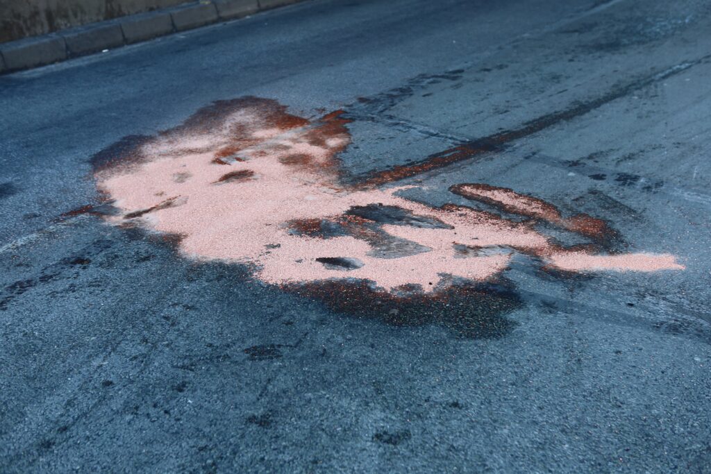Politiet er ifølge Presse-fotos.dk på stedet, ligesom brandvæsnet har været og kaste kattegrus på noget væske, der lå på vejen.