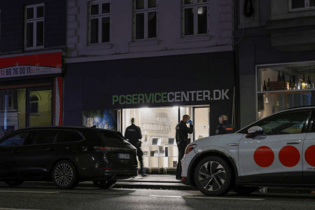 Først senere står det klart, at hændelsen fandt sted ved Frederiks Allé 101, hvor politiet blandt andet afhørte et vidne direkte foran butikken.