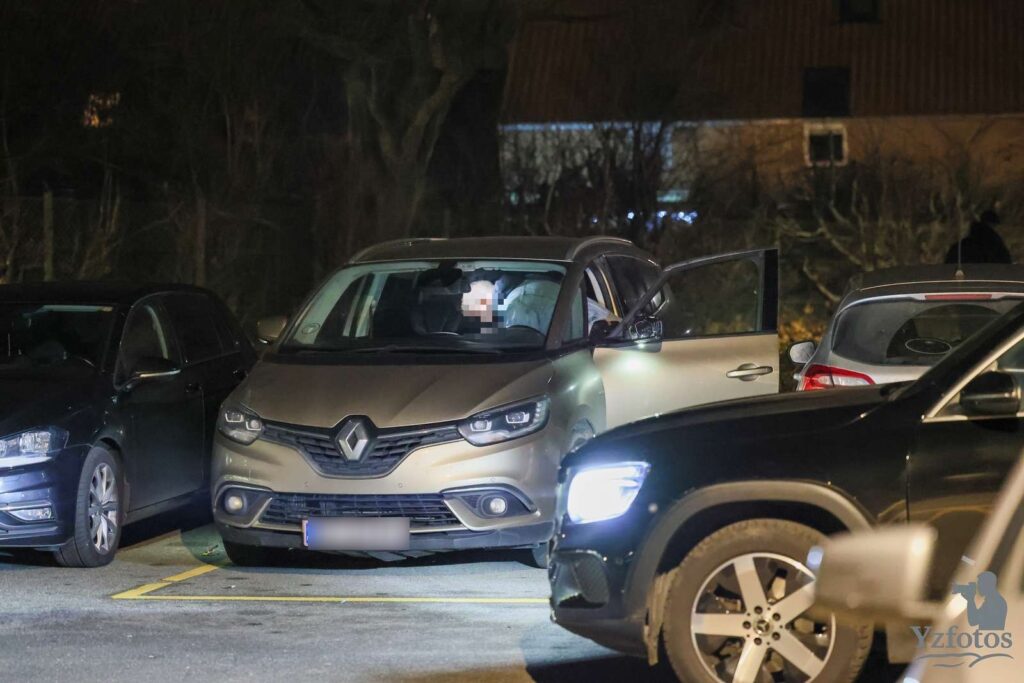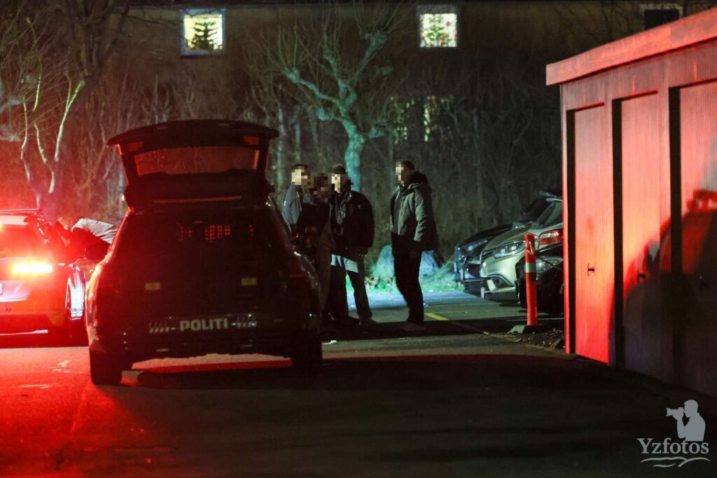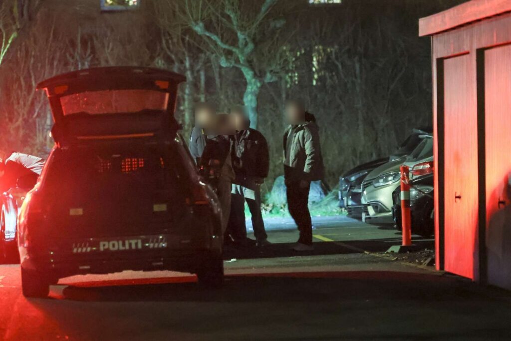 “De er talstærkt til stede her. Betjentene går rundt og tager fat i flere bilhåndtag, mens en større bil bliver undersøgt grundigt.”