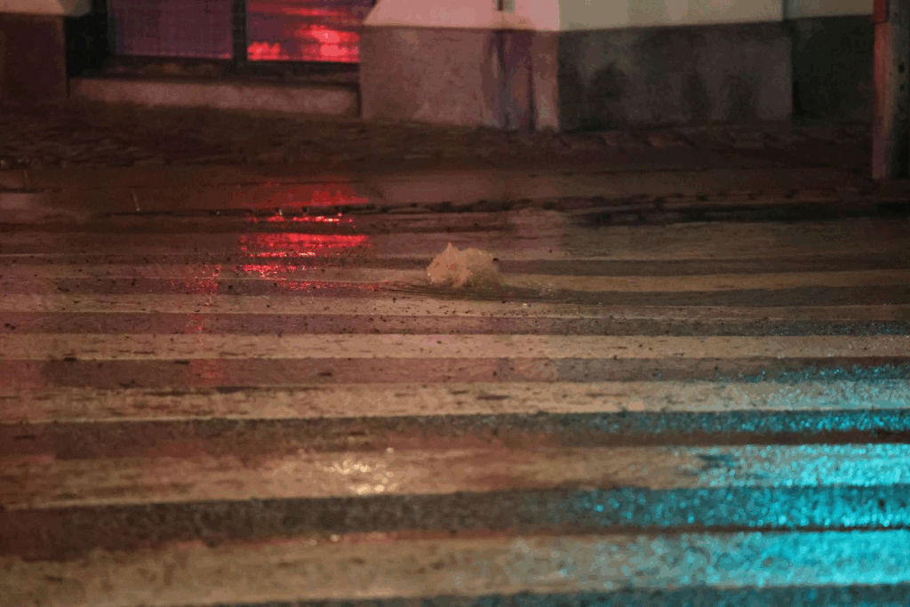 Billeder fra stedet viser, at vandet pibler op fra et fodgængerfelt, hvilket resulterer i en stor mængde vand, der flyder på asfalten.