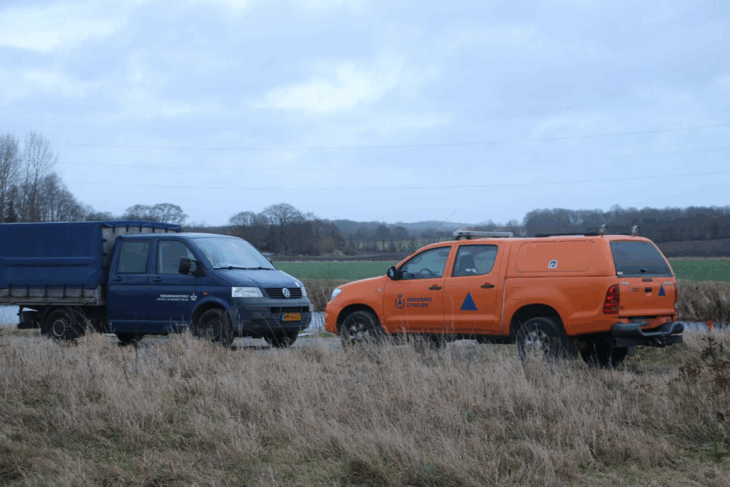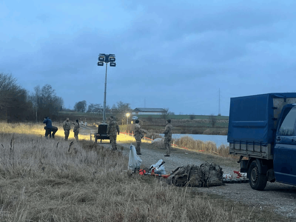 “Beredskabsstyrelsen er til stede herude ved en mark, hvor der også er en sø.”
