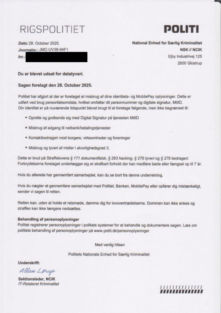 I brevet udgiver svindlerne sig for at være fra Politiets Nationale enhed for Særlig Kriminalitet. Det fremgår ofte, at modtageren er blevet udsat for datatyveri og i den forbindelse har fået misbrugt sine identitets- og MobilePay-oplysninger, skrives det i advarslen.